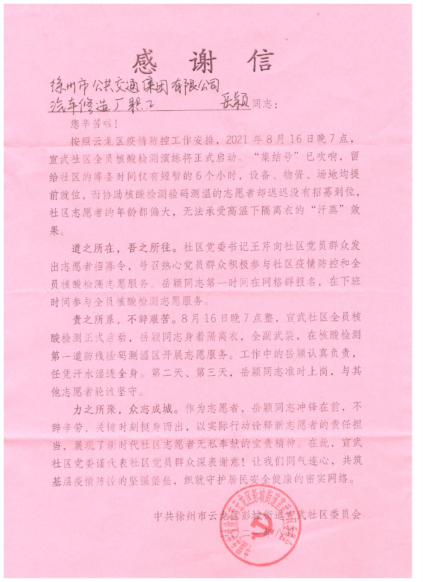 2021年8月16日晚7點,宣武社區(qū)全員核酸檢測演練正式啟動,時間緊任務重。由于社區(qū)志愿者的年齡普遍偏大,難以承受高強度的工作,此時社區(qū)黨委向廣大群眾發(fā)出了志愿者招募令,保修公司岳穎同志第一時間報名參加,利用下班時間參與志愿服務。
