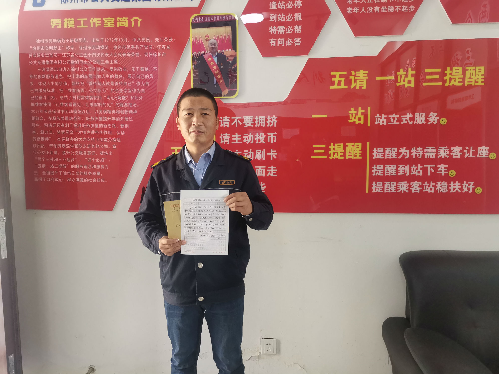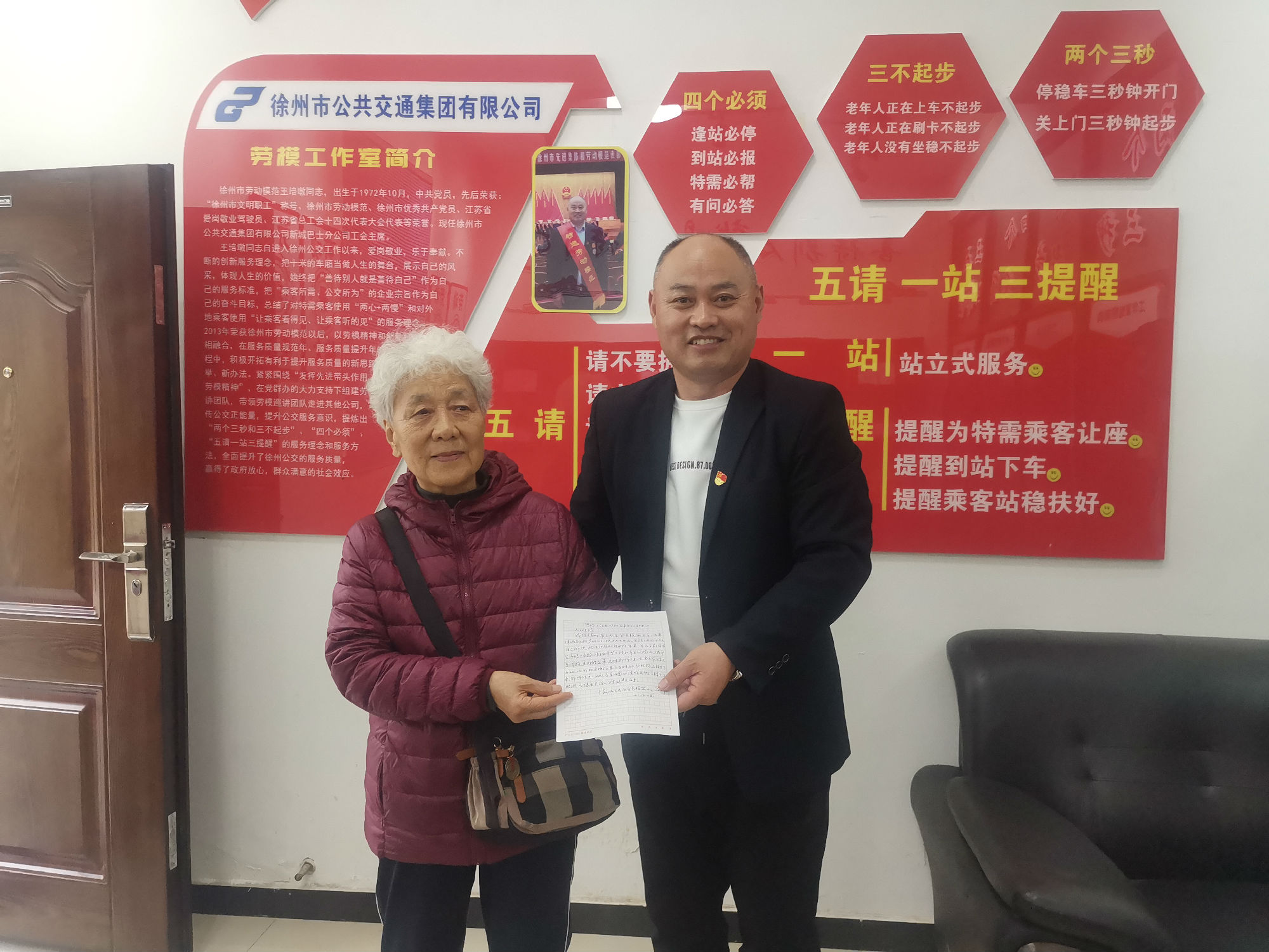 10月28日下午,一位滿頭銀發(fā)的老人拿著一封親手寫的感謝信來(lái)到了徐州公交新城公司,老人說(shuō):“有一位駕駛員,經(jīng)常幫助我和老伴,但我不知道他叫什么,只知道他在46路2750號(hào)公交車?!苯?jīng)核實(shí),正是46路公交駕駛員郭開明師傅。