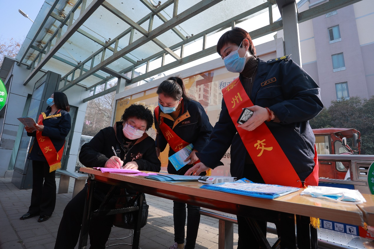 活動現(xiàn)場,懸掛起了標有“公交送溫暖、服務走在前”的橫幅標語,志愿者們統(tǒng)一身著行業(yè)服,身披鮮紅綬帶。大家分工明確,以飽滿的精神面貌向市民宣傳綠色出行,發(fā)放《徐州公交乘車線路指南》,引導市民文明乘車,解答市民問題,協(xié)助駕乘人員做好“健康碼”查驗工作,幫助老年人注冊“健康碼”,教老年人使用“徐州公交”APP查詢公交線路實時狀態(tài),攙扶特需乘客上下車等。