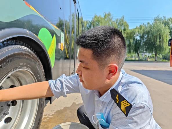 “衣服都濕透了,別弄了,先歇歇吧?!薄皼]事,我把衛(wèi)生弄好了就去?!?.....眼前這個小伙是603路的張?zhí)祧危弥萃r間,他一邊用布擦拭著輪轂,一邊用手擦拭臉上的汗珠。忙完后,發(fā)現(xiàn)發(fā)車時間已到,他立即回到駕駛室,等待乘客的到來和發(fā)班指令,沒來得及喝上一口水。