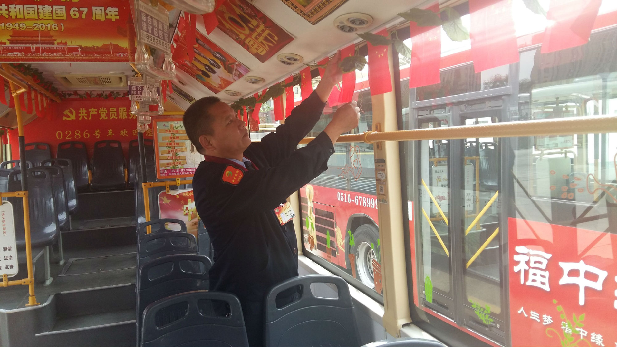公交駕駛工作平凡、枯燥,但曹瑞國(guó)愛(ài)動(dòng)腦、喜創(chuàng)新,總會(huì)給乘客不一樣的驚喜,感受不一樣的出行服務(wù)。適逢節(jié)日、活動(dòng),他總會(huì)換著花樣地自掏腰包,給車上乘客一個(gè)驚喜:春節(jié),購(gòu)置小紅燈籠掛滿整個(gè)車廂,給乘客帶來(lái)濃濃的年味;母親節(jié),他準(zhǔn)備了100支康乃馨、祝福卡,送給“媽媽級(jí)”女乘客,道上一聲由衷的問(wèn)候;今年七一,為慶祝建黨95周年,他準(zhǔn)備了95面黨旗,95本黨章,以及黨徽、紀(jì)念章給乘客,并在車廂廣播入黨宣言、革命紅歌;9月22日宣傳世界無(wú)車日,他制作了10個(gè)卡通宣傳牌,加班安裝在車廂四周,號(hào)召市民選用綠色交通工具出行,減少城市污染;十一,他將一百面國(guó)旗掛在車廂內(nèi),被媒體稱為“國(guó)旗哥”;10月9日重陽(yáng)節(jié),為老年乘客發(fā)放免費(fèi)鞋墊……