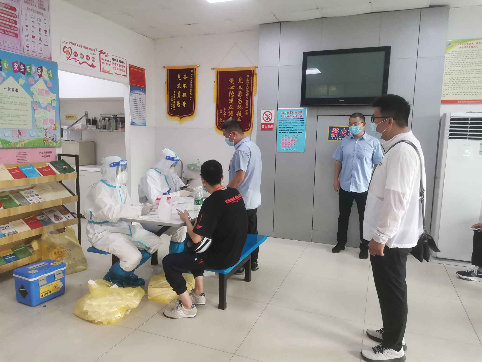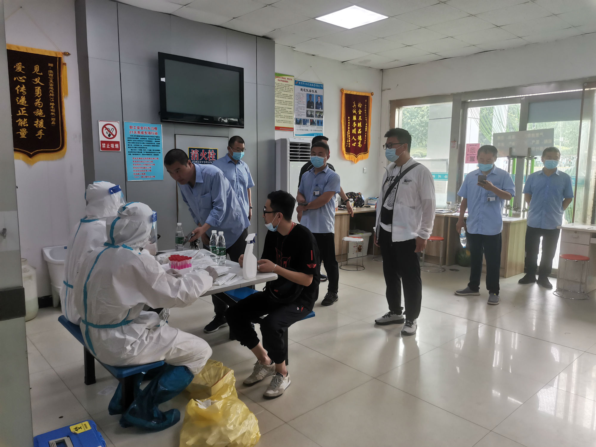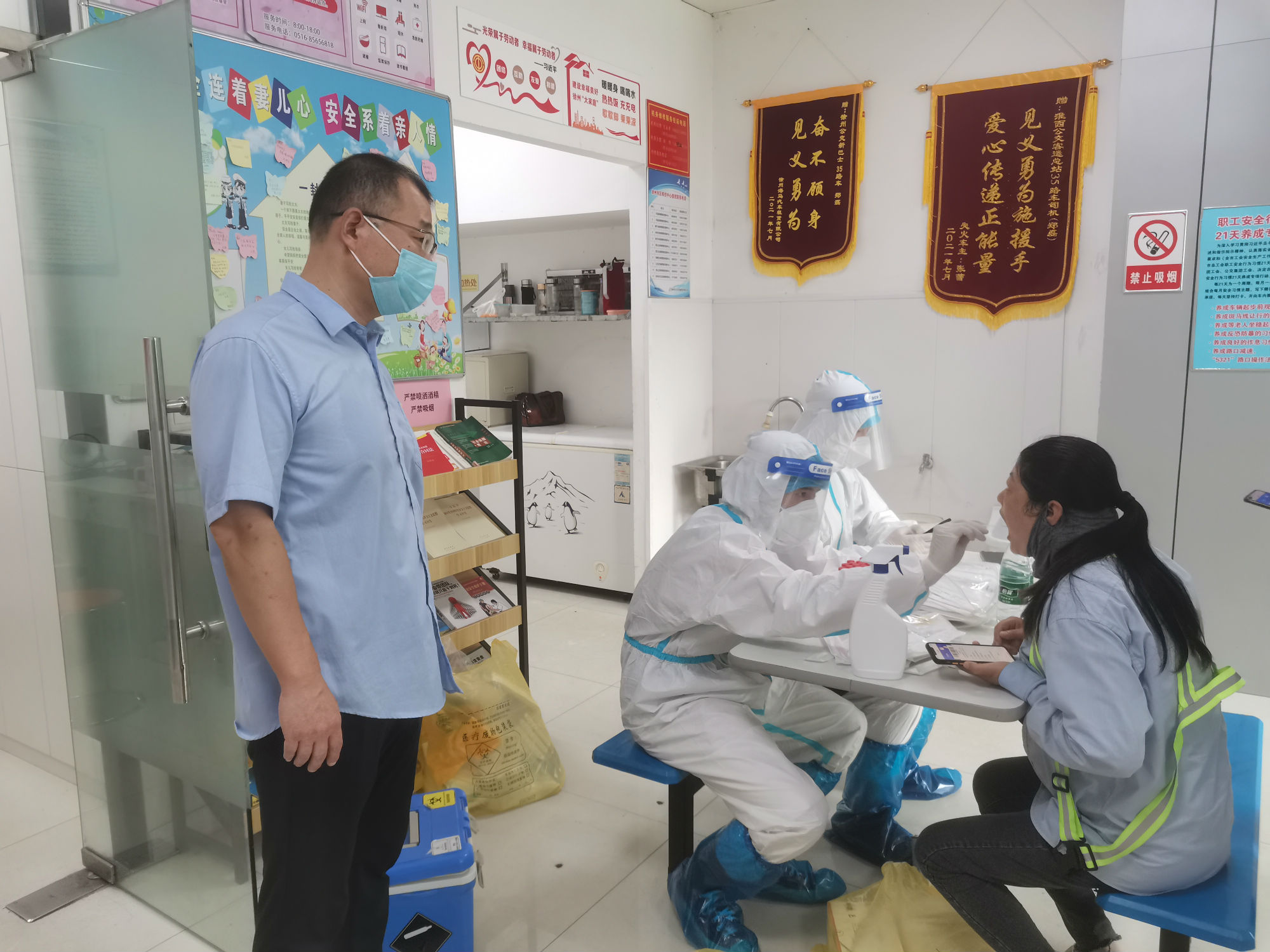 核酸檢測期間,新巴士公司各級管理人員做好后勤保障工作,經(jīng)過亮碼認證、衛(wèi)生消毒、信息核對等程序后,職工才被獲準進入核酸采集室。同時,公司將空間較大的淮西客運站調(diào)度室作為采集點,并安排專職人員維持現(xiàn)場秩序。