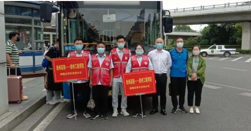 同時,為了服務好學生返校,新城公司組織雷馳平安志愿者服務隊在徐州東站出口處集結,隊員們高舉引導牌,迎接工程學院學子的到來。現(xiàn)場幫助學生們提箱子拿行李,測體溫,查驗“兩碼”,引導學生有序上車。并在車內備有應急藥箱、消毒濕巾、口罩、飲用水等物資,受到學生們的一致好評!
