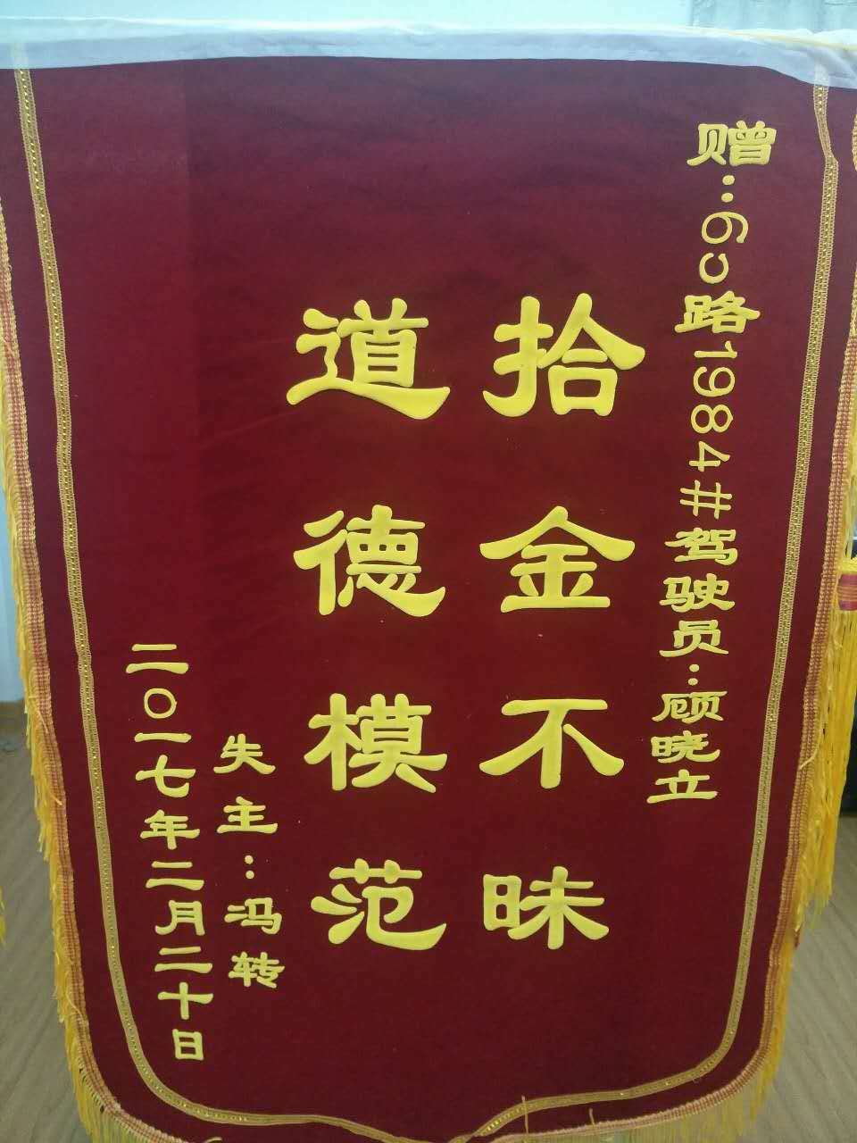 2月20日上午,乘客馮先生從第四人民醫(yī)院乘65路車到礦務(wù)局下車去兒童醫(yī)院給孩子看病,匆忙下車時(shí)把手提包丟在車上,當(dāng)時(shí)非常著急,內(nèi)有身份證兩張,銀行卡數(shù)張,由于丟失身份證不能給孩子辦理出院手續(xù),焦急萬(wàn)分。65路1984號(hào)車駕駛員顧曉立拾到后,妥善保管,交還馮先生。馮先生十分感謝,特送來錦旗一面,并撥打12345表?yè)P(yáng)。