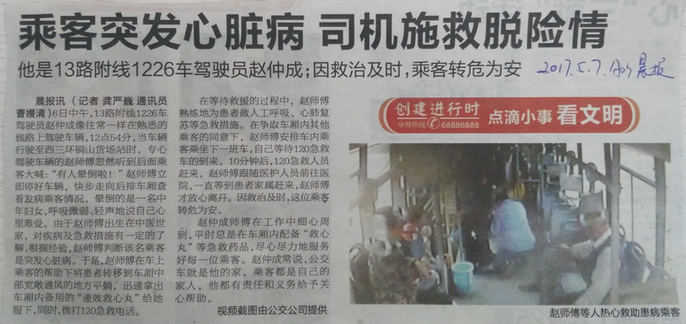 當(dāng)天中午,13路附線1226車駕駛員趙仲成像往常一樣在熟悉的線路上駕駛車輛。12點54分,當(dāng)車輛行駛至西三環(huán)銅山貨場站時,專心駕駛車輛的趙師傅忽然聽到后面乘客大喊:“有人暈倒啦”,趙師傅立即停好車輛、快步走向后排車廂查看發(fā)病乘客情況,暈倒的是一名中年婦女,呼吸微弱、輕聲地說自己心里難受。由于趙師傅出生在中醫(yī)世家,對疾病及急救措施有一定的了解,根據(jù)經(jīng)驗,趙師傅判斷該名乘客是忽發(fā)心臟病,于是,趙師傅在車上乘客的幫助下將患者轉(zhuǎn)移到車廂中部寬敞通風(fēng)的地方平躺,迅速拿出車廂內(nèi)備用的“速效救心丸”給她服下,同時,撥打120急救電話。在等待救援的過程中,趙師傅熟練地為患者做人工呼吸、心肺復(fù)蘇等急救措施。在爭取車廂內(nèi)其他乘客的同意下,趙師傅安排車內(nèi)乘客乘坐下一班車,自己等待120急救車的到來。10分鐘后,120急救人員趕來,趙師傅跟隨醫(yī)護(hù)人員前往醫(yī)院,一直等到患者家屬趕來,趙師傅才放心的離開。