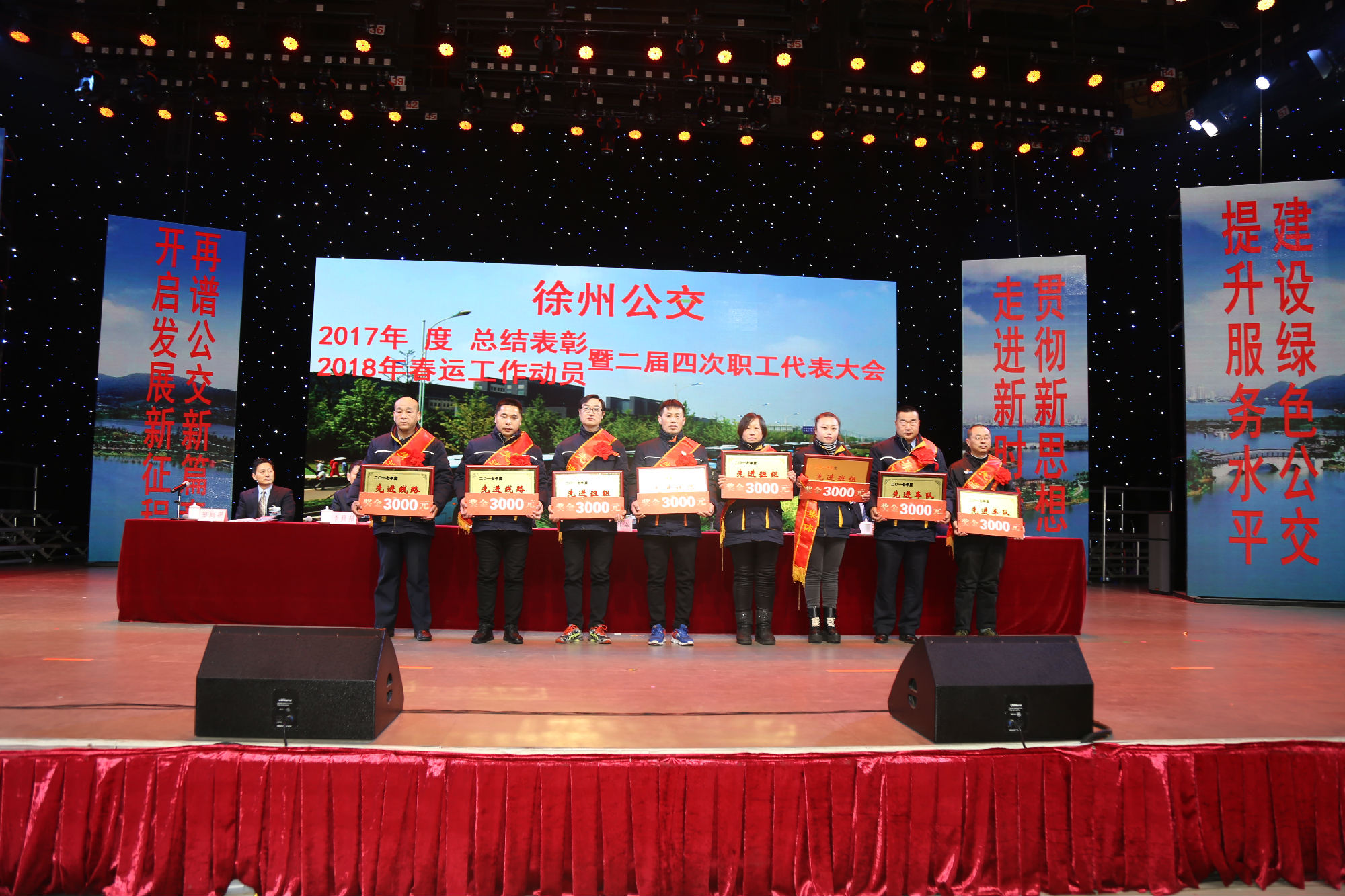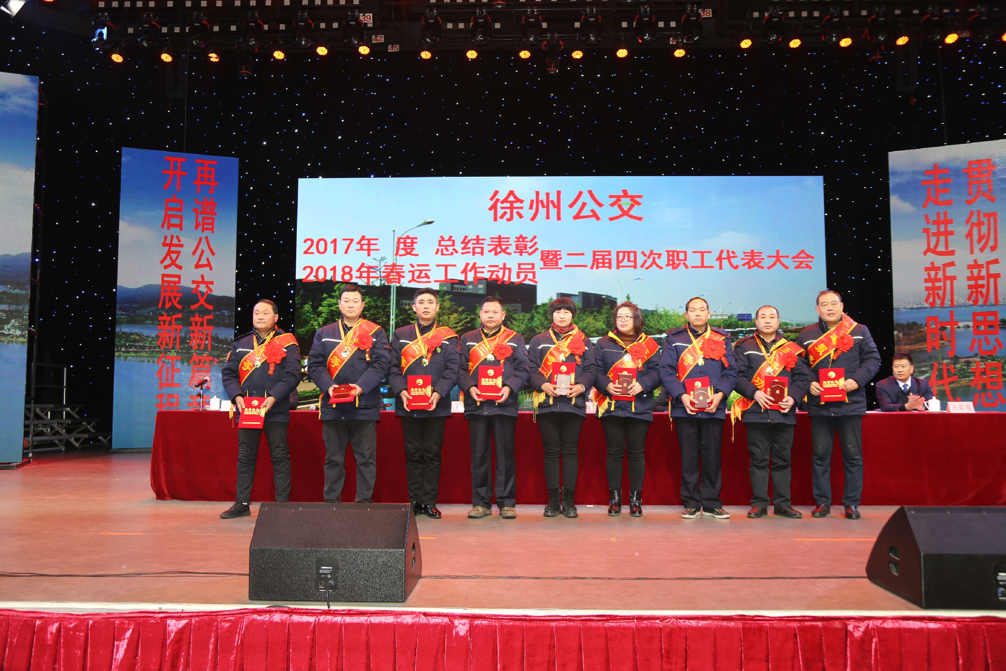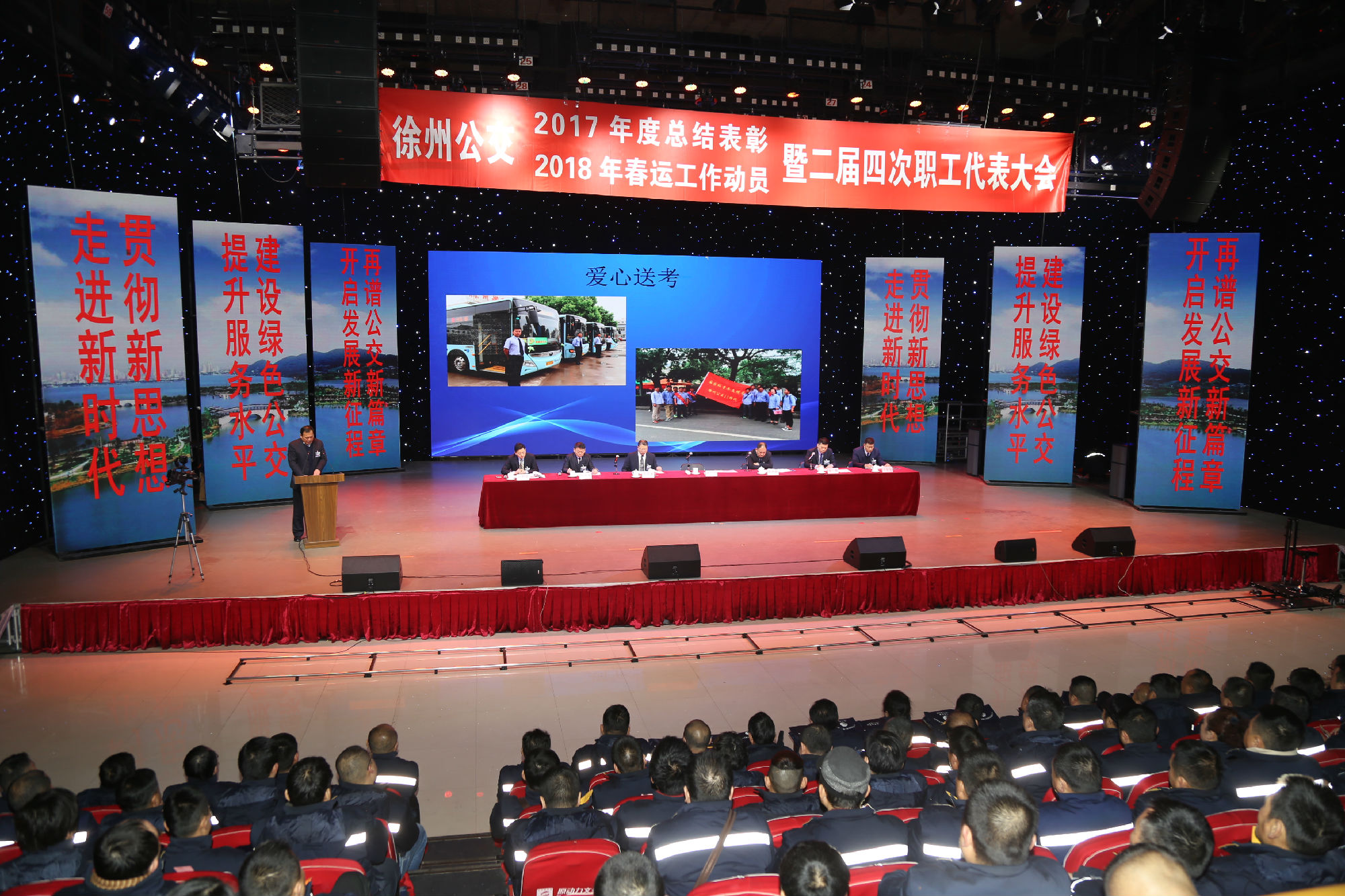 大會在莊嚴的國歌聲中拉開序幕。公司董事長、總經(jīng)理杜紅軍首先作經(jīng)理工作報告,對2017年“改革創(chuàng)新年”工作進行了全面總結(jié):一、實施“同城同價”,優(yōu)化運營管理,實現(xiàn)服務水平新突破。連續(xù)第五年面向全市征集線路線網(wǎng)優(yōu)化意見近3000條,據(jù)此新辟優(yōu)化線路29條。二、深化資源共享,在互聯(lián)網(wǎng)+企業(yè)管理上譜寫新藍圖。繼續(xù)深化集中維修,推行集中例檢。論證實施支付寶、微信、銀行卡閃付等智能化移動支付方式。三、深化文明創(chuàng)建,打造優(yōu)秀公交,服務民生出行贏得新口碑。在國檢、省檢中未失一分,圓滿完成創(chuàng)建驗收任務。投訴總數(shù)和有責投訴同比實現(xiàn)“雙下降”。乘客表揚同比上升近20%。公司在2016年行風熱線上線單位滿意度評議投票中名列榜首。率先打造公交行業(yè)禮讓斑馬線嶄新形象,圓滿完成公交反恐防暴工作。四、著力綜合管理,聚合內(nèi)生動能,增強企業(yè)發(fā)展新優(yōu)勢。重新修訂2012版管理制度匯編和新版《徐州公交獎懲條例》。五、踐行十九大精神,推進和諧發(fā)展,開創(chuàng)黨群工作新面貌。接著,杜總分析了工作中存在的問題,提出下步工作重點。一、建設(shè)現(xiàn)代化公交,提升經(jīng)營管理水平,保障企業(yè)良性有序運行;二、踐行集約共享理念,深化科技應用,開創(chuàng)公交事業(yè)發(fā)展新局面;三、建設(shè)平安公交,提升服務口碑,展示文明公交新形象;四、踐行十九大精神,構(gòu)建和諧公交,開啟黨群工作新面貌。