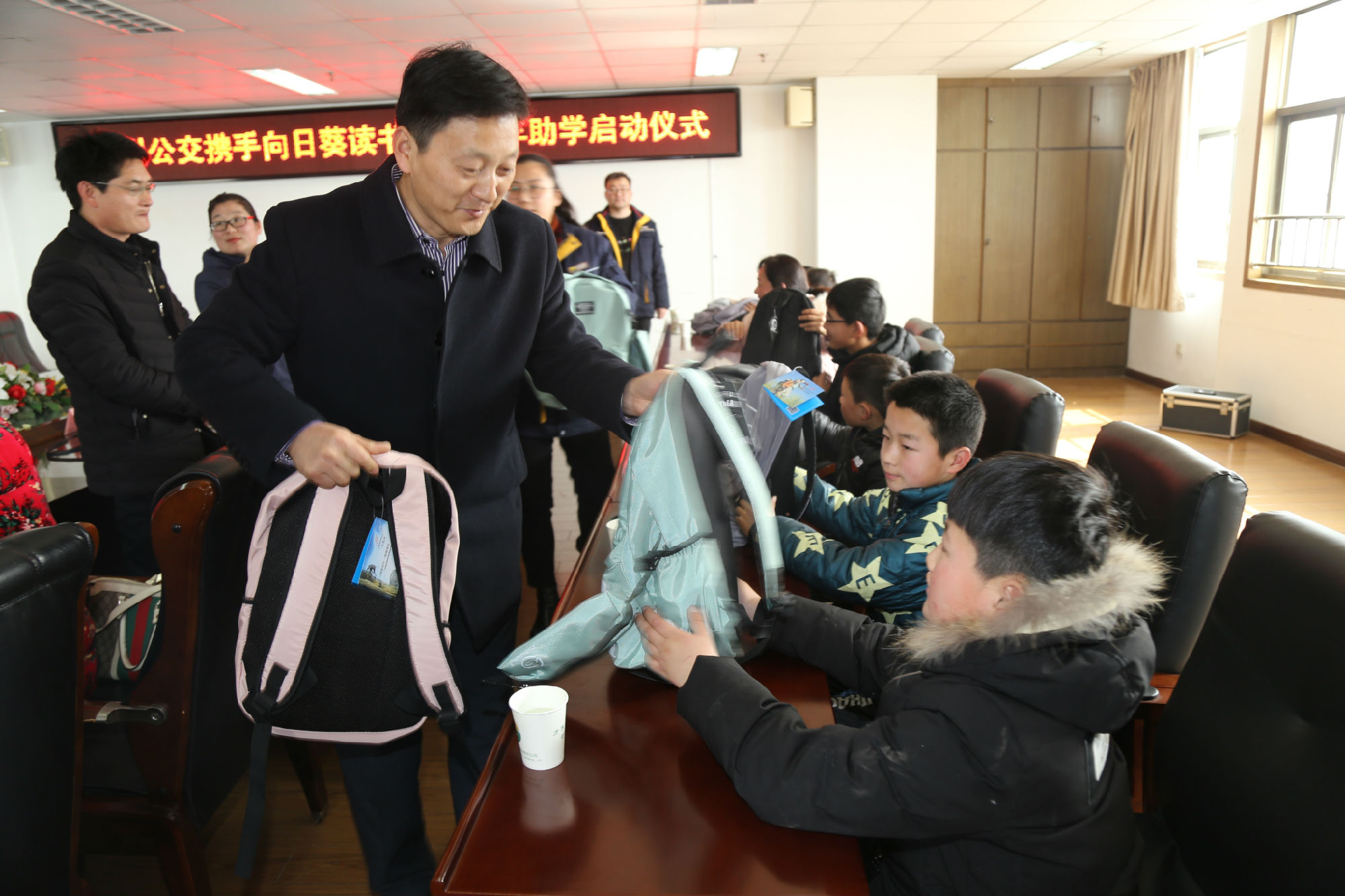 2月24日上午,徐州公交攜手向日葵讀書點(diǎn)2018年助學(xué)啟動(dòng)儀式在有限公司十一樓會(huì)議室舉行。公司董事長(zhǎng)、總經(jīng)理杜紅軍,工會(huì)主席竇同銀,調(diào)研員張同剛、祖伯鴻等領(lǐng)導(dǎo)出席了活動(dòng)儀式。最美鄉(xiāng)村教師、江蘇省道德模范、向日葵讀書點(diǎn)負(fù)責(zé)人郁雪群,向日葵讀書點(diǎn)副會(huì)長(zhǎng)、大固小學(xué)校長(zhǎng)褚紅玉,向日葵讀書點(diǎn)副會(huì)長(zhǎng)王光彪,受助家長(zhǎng)代表張玲,邳州邢樓鎮(zhèn)受資助10名貧困兒童、5名小志愿者等受邀參加儀式。