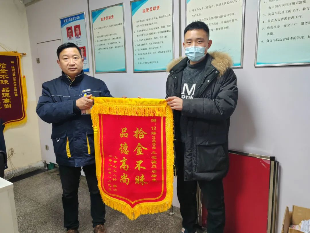 不久后,抵達(dá)終點(diǎn)站的駕駛員陳朋打掃車輛衛(wèi)生時(shí),在座位上發(fā)現(xiàn)了一個(gè)藍(lán)色文件袋,內(nèi)有戶口本、結(jié)婚證、房產(chǎn)證、購(gòu)房合同和錢包等重要物品。陳朋立即將其送到調(diào)度室,與車隊(duì)工作人員核對(duì)好文件袋內(nèi)的物品后,隨即聯(lián)系了高鐵站派出所,經(jīng)過多方查找聯(lián)系到孫女士,物品失而復(fù)得,孫女士難掩心中的喜悅,與工作人員約好地點(diǎn),最終順利地取回了失物。“這些材料都是房屋過戶用的,多虧陳師傅撿到?!睂O女士十分感謝,當(dāng)即撥打了12345熱線電話對(duì)陳朋拾金不昧、急乘客所急的做法進(jìn)行表?yè)P(yáng),并于1月11日送來了一面印有“拾金不昧好風(fēng)尚 情暖人間似親人”的錦旗。